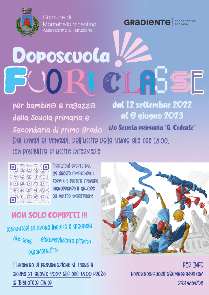 Con il nuovo anno scolastico a Montebello Vicentino torna anche il servizio del doposcuola. Denominato “Fuori classe”, sarà attivo dal 12 settembre 2022 al 9 giugno 2023, su iniziativa dell’Assessorato all’Istruzione, e sarà a disposizione degli studenti della scuola primaria e secondaria di primo grado.