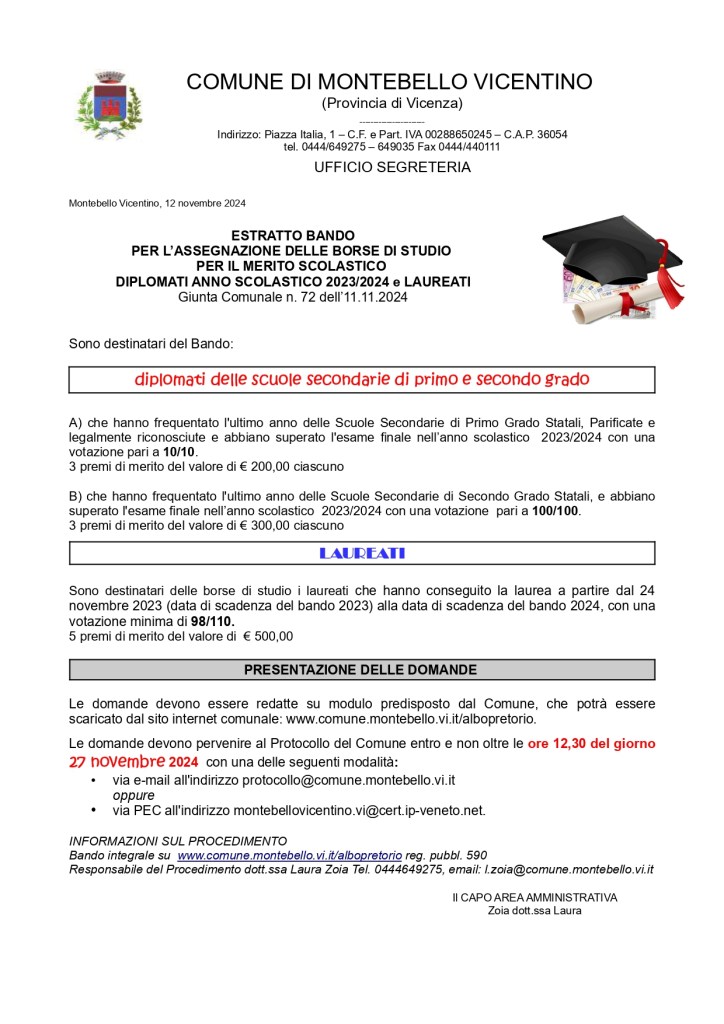 2023/2024 con una votazione pari a 10/10 (dieci/decimi), per i quali sono previsti tre premi di merito del valore di 200 euro ciascuno; i diplomati delle scuole secondarie di secondo statali che abbiano superato gli esami finali nell’anno scolastico 2023/2024 con una votazione minima di 100/100 (cento/centesimi), per i quali sono previsti tre premi di merito del valore di 300 euro ciascuno; i laureati che hanno conseguito la laurea a partire dal 24 novembre 2023 (data di scadenza del