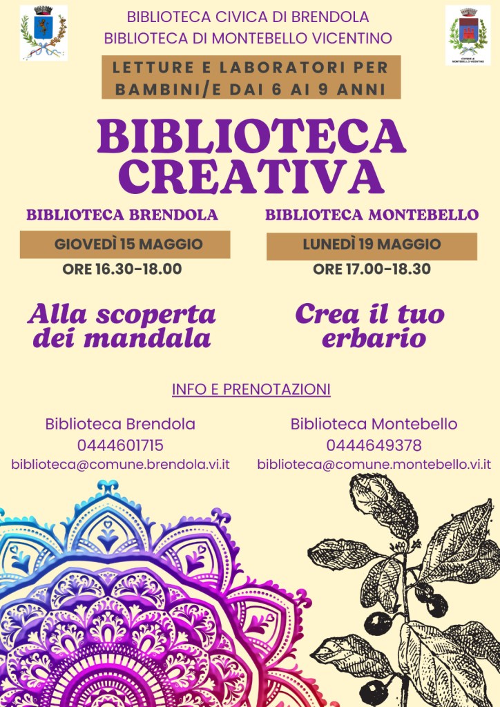 Il primo è in programma giovedì 15 maggio dalle 16.30 alle 18 in biblioteca a Brendola, quando i giovani partecipanti andranno alla scoperta dei mandala. Info e prenotazioni allo 0444 601715 o via mail scrivendo a biblioteca@comune.brendola.vi.it.