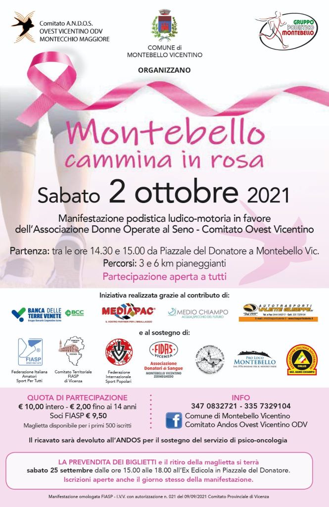 In occasione dell’Ottobre Rosa (mese internazionale della prevenzione del tumore al seno) del Comitato Andos Ovest Vicentino, l’Amministrazione comunale di Montebello Vicentino (in collaborazione con la stessa Andos e il Gruppo Podistico Montebello) propone “Montebello cammina in rosa”, manifestazione podistica ludico-motoria il cui ricavato sarà devoluto al servizio di sostegno psicologico che l’Andos offre alle donne colpite dalla malattia durante le fasi pre e post-intervento.