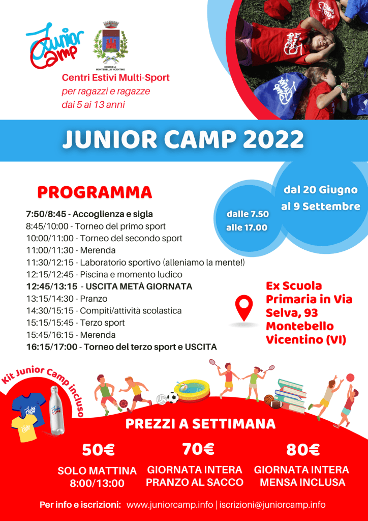 A Montebello Vicentino sta arrivando lo Junior Camp 2022, ossia i centri estivi multi-sport per bambini e ragazzi dai 5 ai 13 anni. Ecco i dettagli e le informazioni per iscriversi.