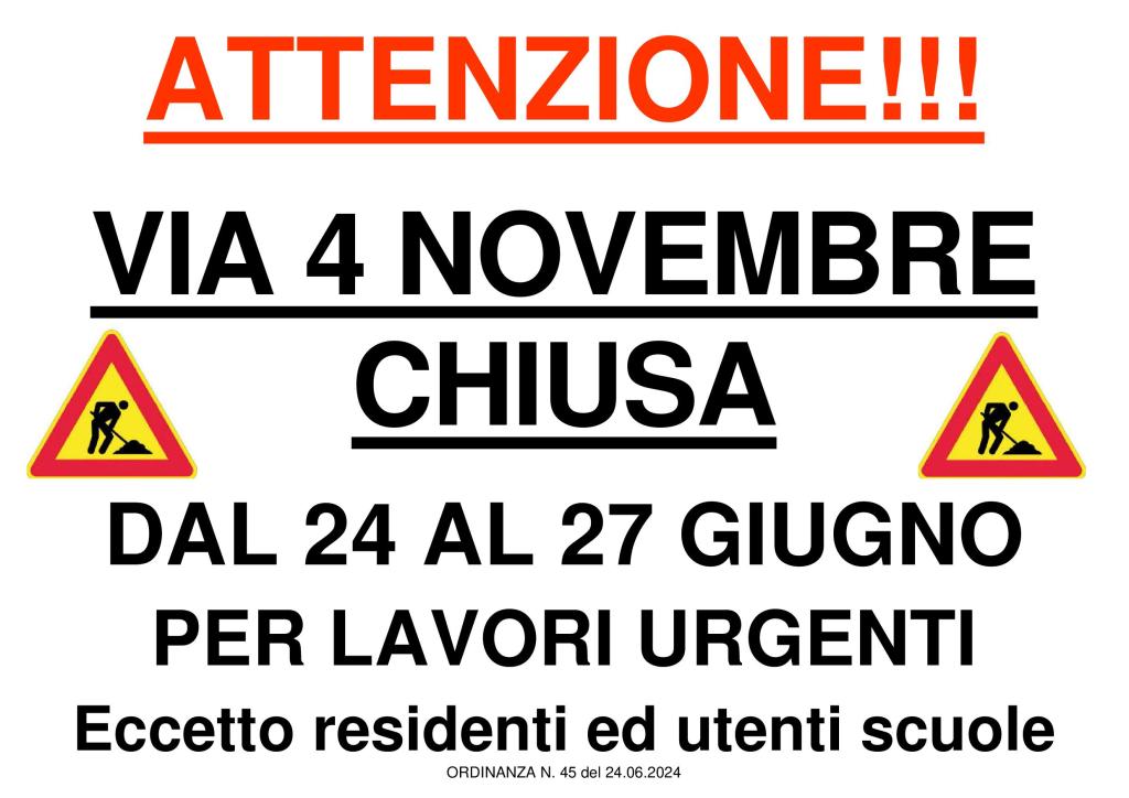 Per permettere l’esecuzione, da parte della società Medio Chiampo, di lavori urgenti sulla rete fognaria, il Comune di Montebello Vicentino ha emesso un’ordinanza che dispone la chiusura totale al traffico veicolare, dal 24 al 27 giugno e comunque fino al termine dei lavori, del tratto di via 4 Novembre che va dall’incrocio con via 8 Aprile all’incrocio con via G. Vaccari.