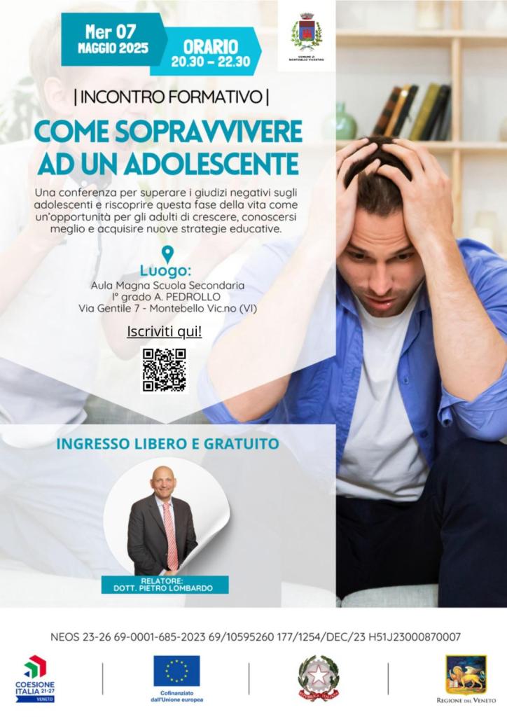 Il Comune di Montebello Vicentino propone l’incontro formativo dal titolo “Come sopravvivere ad un adolescente”. L’appuntamento è mercoledì 7 maggio alle 20.30 nell’aula magna della scuola secondaria di primo grado “A. Pedrollo” (via Gentile 7) con il pedagogista a orientamento psicologico e scrittore Pietro Lombardo, che condurrà il pubblico in una serata ricca di spunti, sorrisi e consigli pratici per genitori, educatori e chiunque viva (o sopravviva!) accanto a un adolescente.