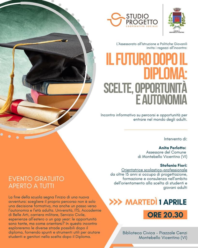 L’Assessorato all’Istruzione e alle Politiche giovanili del Comune di Montebello Vicentino, in collaborazione con la cooperativa sociale Studio Progetto, invita gli studenti degli istituti superiori (in particolare quelli di quarta e di quinta) e i loro genitori ad un incontro informativo sui percorsi e le opportunità che si possono aprire dopo l’ottenimento del diploma di maturità.