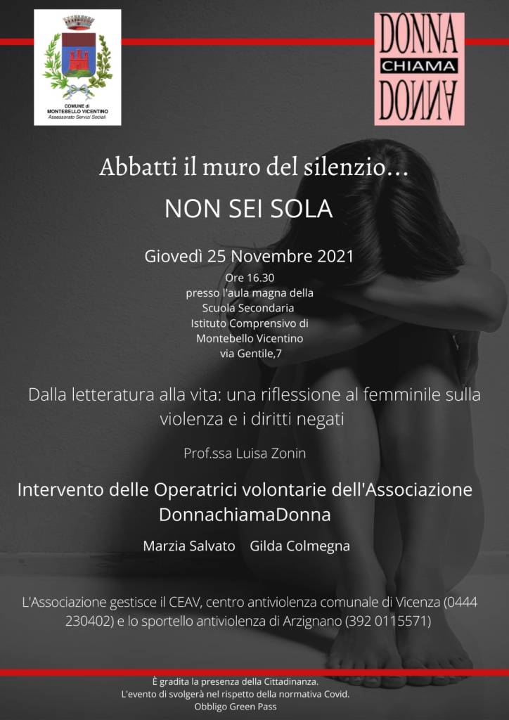 “Abbatti il muro di silenzio… non sei sola”: questo il titolo dell’incontro pubblico proposto dall’Assessorato ai Servizi Sociali, in collaborazione con l’Associazione Donna Chiama Donna, in occasione della Giornata internazionale per l’eliminazione della violenza contro le donne.