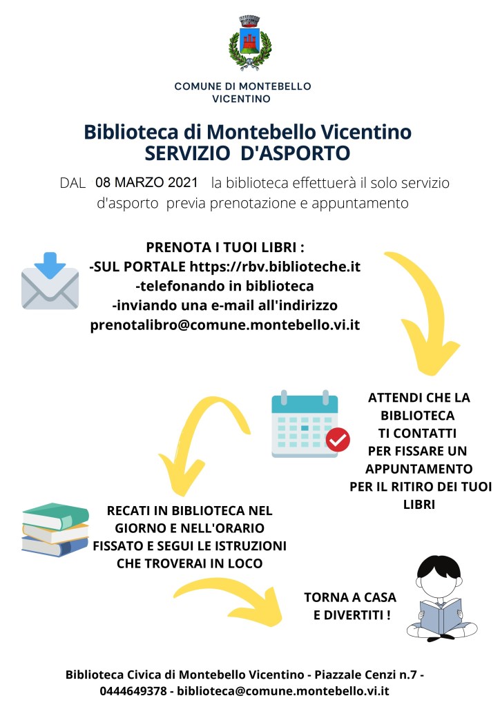 Considerato il passaggio in fascia arancione del Veneto, dall’8 marzo in biblioteca è possibile ritirare materiale solo attraverso il servizio d’asporto, previ prenotazione e appuntamento.