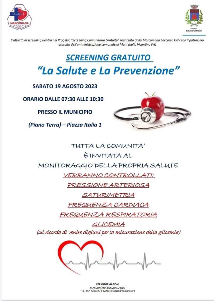 “La salute e la prevenzione” – così è denominata l’iniziativa – è un’attività di screening che rientra nel progetto “Screening Comunitario Gratuito”, realizzato dalla Marconiana Soccorso odv con il patrocinio dell’amministrazione comunale di Montebello Vicentino.