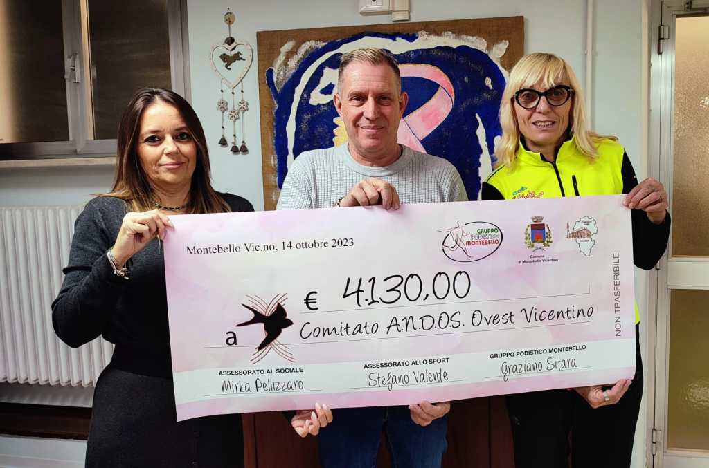 Oltre 4.000 euro a favore degli interventi a sostegno delle donne operate per un tumore al seno. Ammonta precisamente a 4.130 euro il ricavato della manifestazione podistica “Montebello cammina in rosa”, andata in scena il 14 ottobre a Montebello Vicentino nell’ambito dell’Ottobre Rosa, il mese della prevenzione organizzato dal Comitato Andos Ovest Vicentino.
