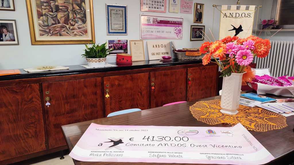 La consegna dell’assegno simbolico è avvenuta nella sede dell’Andos: presenti il sindaco Dino Magnabosco, l’assessore al sociale Mirka Pellizzaro, l’assessore allo sport Stefano Valente, la presidente dell’Andos Isabella Frigo con alcune volontarie, il direttore della Breast Unit dott. Graziano Meneghini e alcune rappresentanti del Gruppo Podistico Montebello.