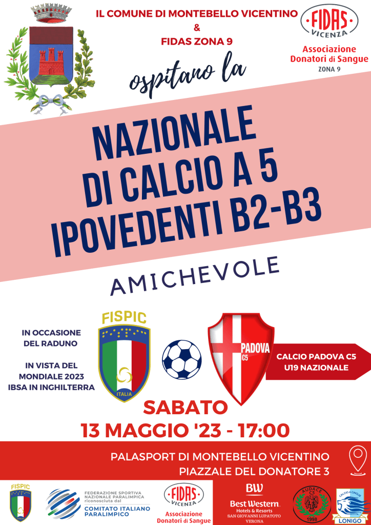Sabato 13 maggio alle 17, il Palasport di Montebello Vicentino ospiterà un’amichevole della Nazionale di calcio a 5 ipovedenti B2-B3 in occasione del raduno di avvicinamento agli International Blind Sports Federation (IBSA) World Games 2023, l’evento più importante per atleti non vedenti e ipovedenti a livello mondiale, che si terrà dal 18 al 27 agosto 2023 a Birmingham, in Inghilterra.