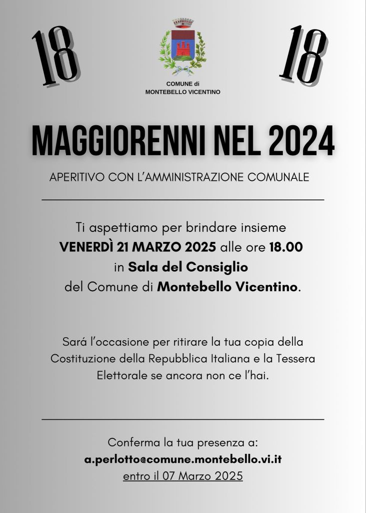 L’Amministrazione comunale invita tutti i giovani divenuti maggiorenni nel 2024 ad uno scambio di saluti e un aperitivo, in programma venerdì 21 marzo alle 18 nella Sala del Consiglio comunale. Per ogni 18enne sarà l’occasione per ritirare una copia della Costituzione Italiana e la tessera elettorale, nel caso in cui non la si avesse ancora.