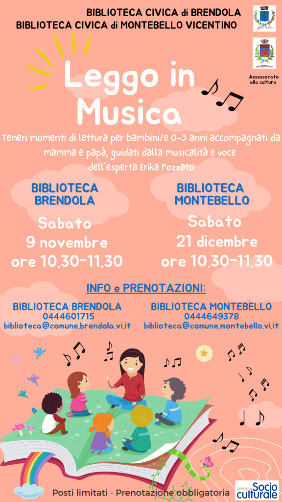Le biblioteche civiche di Montebello Vicentino e Brendola e gli Assessorati alla Cultura dei due rispettivi Comuni propongono l’iniziativa “Leggo in musica”, ossia due teneri appuntamenti di lettura per bambini dagli zero ai tre anni e i loro genitori, accompagnati dalla musicalità e voce dell’esperta Erika Pozzato.
