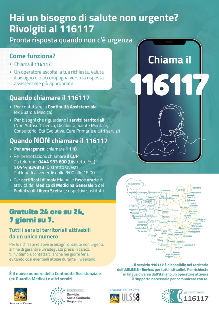 L’Ulss 8 Berica ha attivato un nuovo numero, il 116117, per contattare la Continuità Assistenziale (ex Guardia Medica) e per i bisogni legati ai servizi territoriali (non autosufficienza, disabilità, salute mentale, consultorio, età evolutiva, cure primarie e altri servizi). Il servizio, a disposizione dei cittadini residenti nei Comuni del territorio dell’Ulss 8 Berica, è gratuito e operativo 24 ore su 24, 7 giorni su 7.