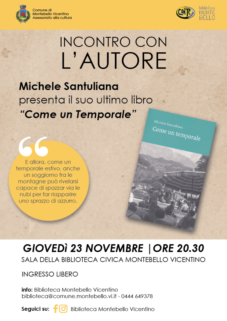 Giovedì 23 novembre, alle 20.30, la biblioteca civica ospita l’incontro con l’autore Michele Santuliana, che presenterà il suo ultimo libro, intitolato “Come un temporale”.