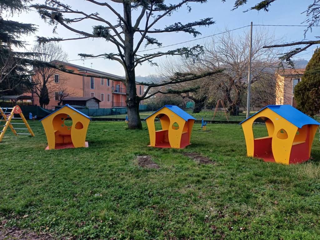 A fronte di un investimento comunale di circa 34.000 euro, sono state installate una giostra a colonne in lega di alluminio riciclato al 60% e in polietilene riciclato al 30%, dotata di sezioni accessibili anche a studenti con disabilità motorie, e tre casette in polietilene colorato riciclabile al 100%.