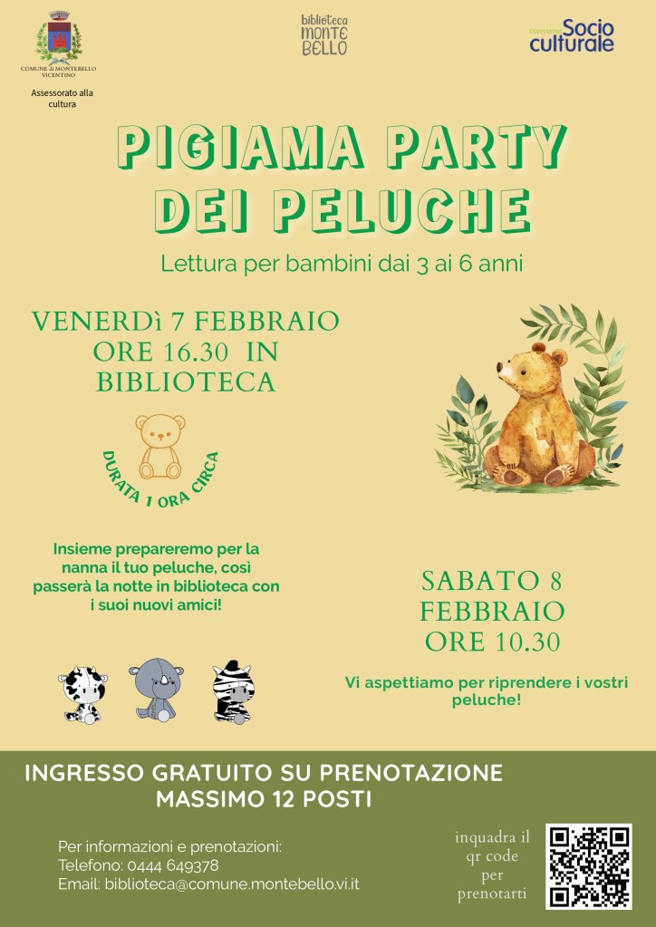 Venerdì 7 febbraio la biblioteca di Montebello ospiterà un pigiama party davvero speciale! Alle 16.30 i bambini e le bambine dai 3 ai 6 anni potranno portare i loro peluche, ascoltare insieme a loro alcune letture e poi prepararli per la nanna, che faranno in biblioteca assieme ai loro nuovi amici. I bambini e le bambine potranno poi riportare a casa i loro peluche sabato 8 febbraio alle 10.30.