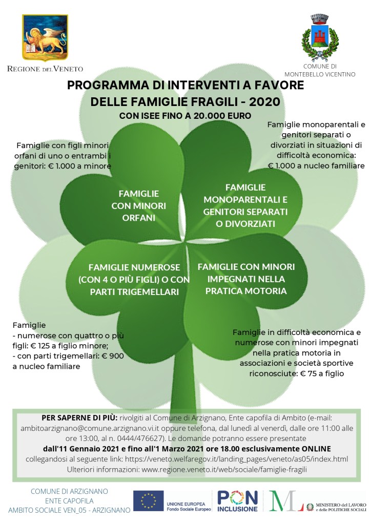 Il Comune informa che la Regione del Veneto, con DGR n. 1309 del 08/09/2020 e DDR n, 104 del 16/09/2020, ha approvato l’intervento a favore delle famiglie fragili residenti in Veneto, ai sensi della Legge Regionale n. 20 del 28/05/2020, art. 10, 11, 13 e 14.