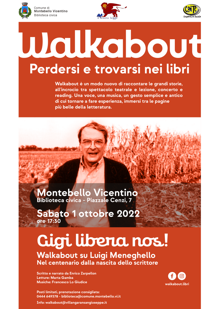 L’Assessorato alla Cultura e la biblioteca civica propongono un walkabout dedicato a Luigi Meneghello, nel centenario dalla sua nascita. L’appuntamento è sabato 1 ottobre alle 17,30 in biblioteca.