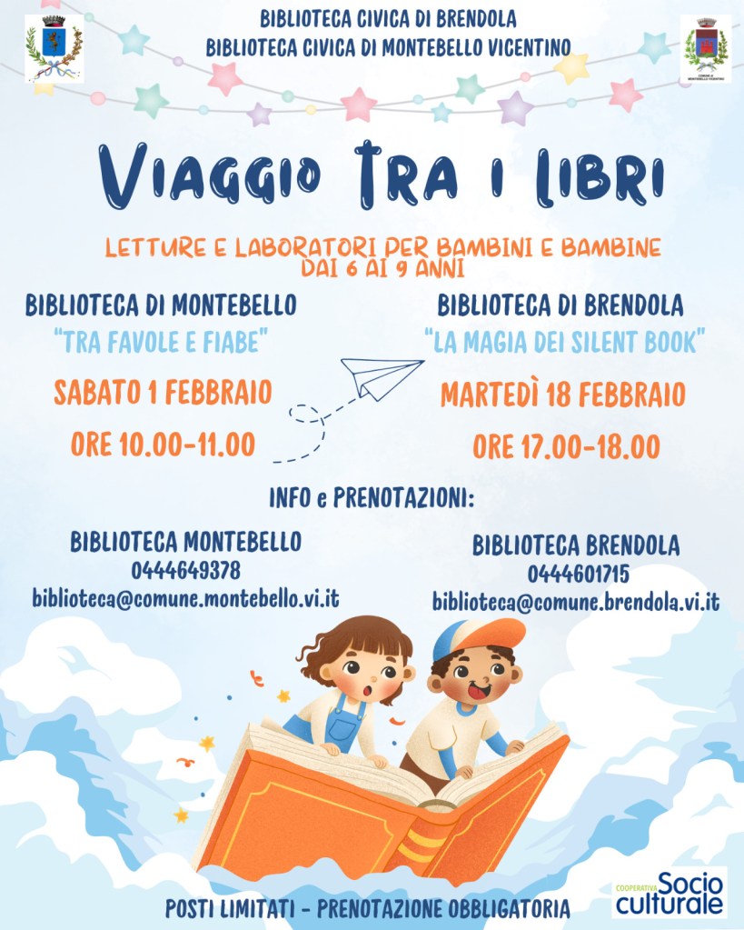 Il primo, intitolato “Tra favole e fiabe”, è in programma sabato 1 febbraio dalle 10 alle 11 in biblioteca a Montebello. Il secondo, chiamato “La magia dei silent book”, si terrà invece martedì 18 febbraio dalle 17 alle 18 in biblioteca a Brendola.