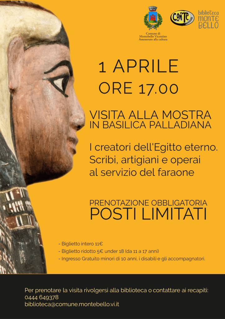 L’Assessorato alla Cultura e la biblioteca civica organizzano, sabato 1 aprile alle 17, una visita alla mostra in Basilica Palladiana a Vicenza “I creatori dell’Egitto eterno. Scribi, artigiani e operai al servizio del faraone”.