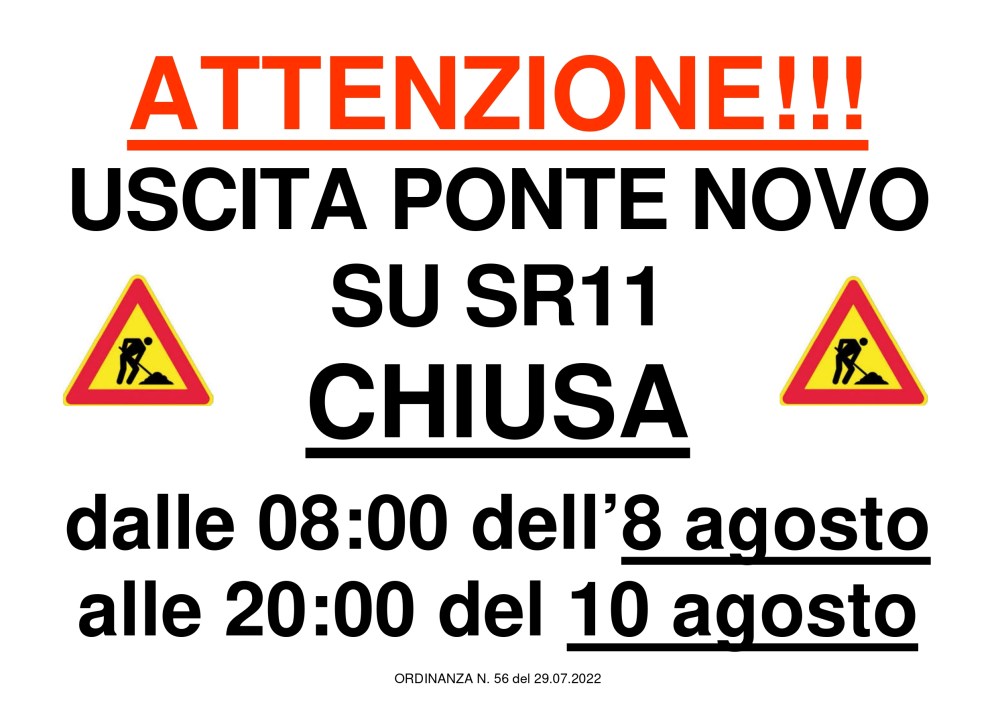 Dall’8 al 10 agosto chiusa per lavori la rampa dal Ponte Novo alla SR11